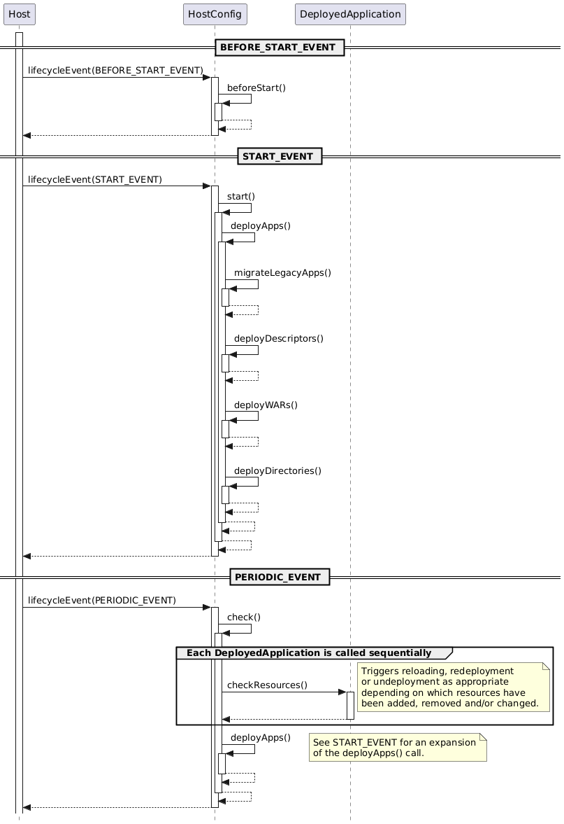 Diagram 6 shows how the HostConfig component responds to lifecycle events triggered by the Host to deploy web applications to the Host.